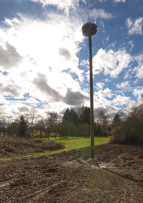 Zwei Storchennester auf langen Stämmen, weil Störche gerne in luftiger Höhe wohnen, um einen guten Blick auf ihr Futtergebiet zu haben und ihre Jungen zu schützen. Zwar kehren die langbeinigen Vögel jedes Jahr zum selben Brutplatz zurück, doch manchmal ist der schon anderweitig besetzt oder der Partner hat sich neu orientiert. Auch Störche aus der Pflegestation im nahen Bornheim könnten in unsere Nester ziehen.